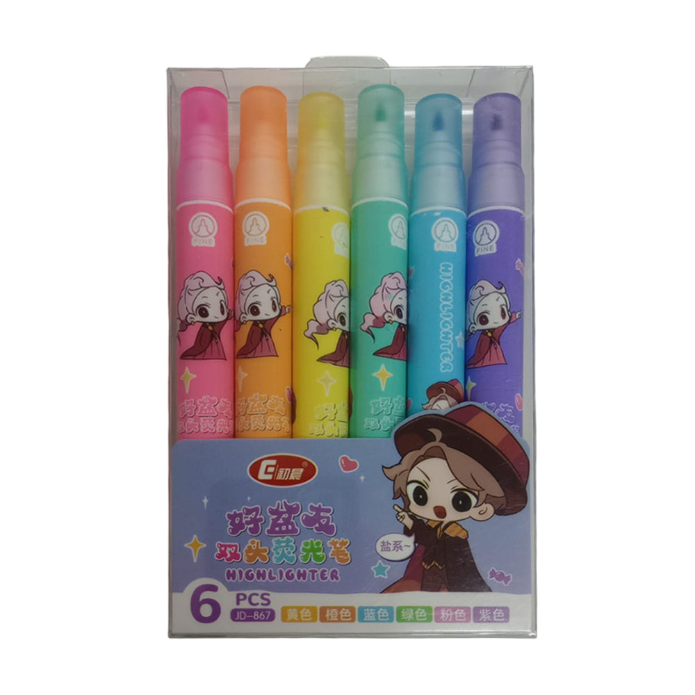 Explora un mundo de color con este set de seis marcadores fluorescentes. Con tonos intensos — rosa, naranja, amarillo, verde, azul y morado — estos marcadores harán que cada trazo cobre vida.
